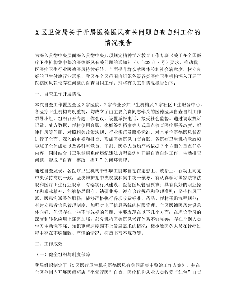 X区卫健局关于开展医德医风有关问题自查自纠工作的情况报告