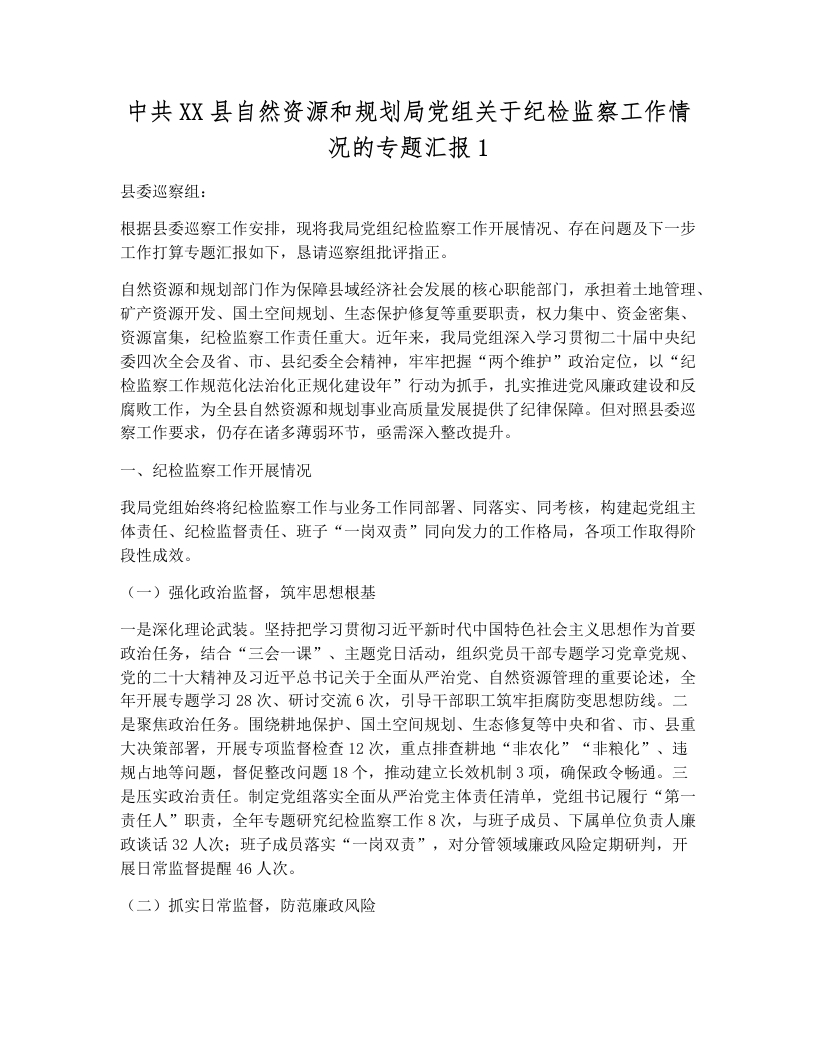 中共XX县自然资源和规划局党组关于纪检监察工作情况的专题汇报1