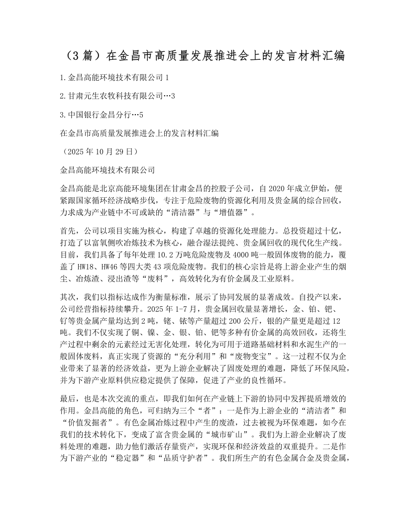 (3篇)在金昌市高质量发展推进会上的发言材料汇编