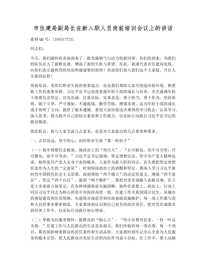 市住建局副局长在新入职人员岗前培训会议上的讲话