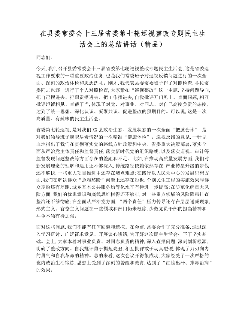 在县委常委会十三届省委第七轮巡视整改专题民主生活会上的总结讲话(精品)