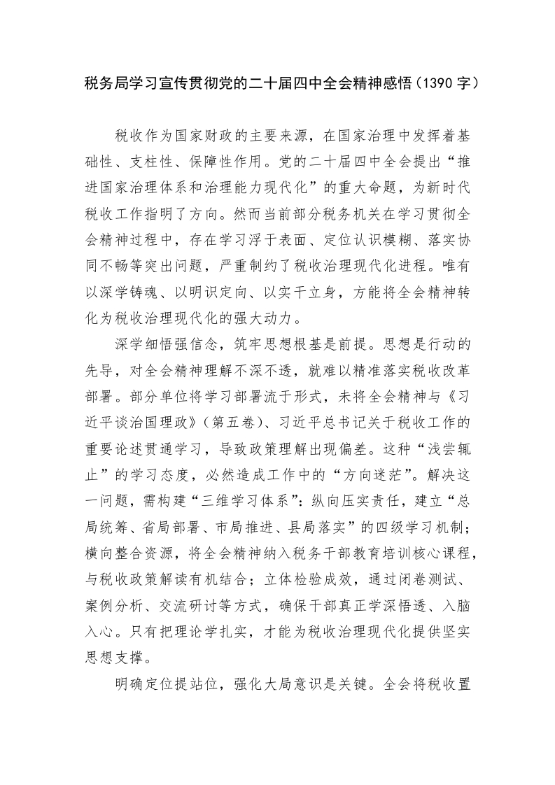 税务局学习宣传贯彻党的二十届四中全会精神感悟(1390字)