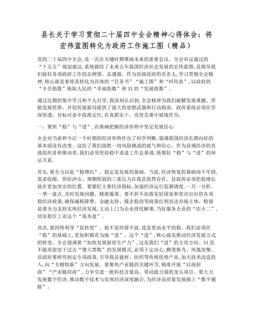 县长关于学习贯彻二十届四中全会精神心得体会:将宏伟蓝图转化为政府工作施工图(精品)