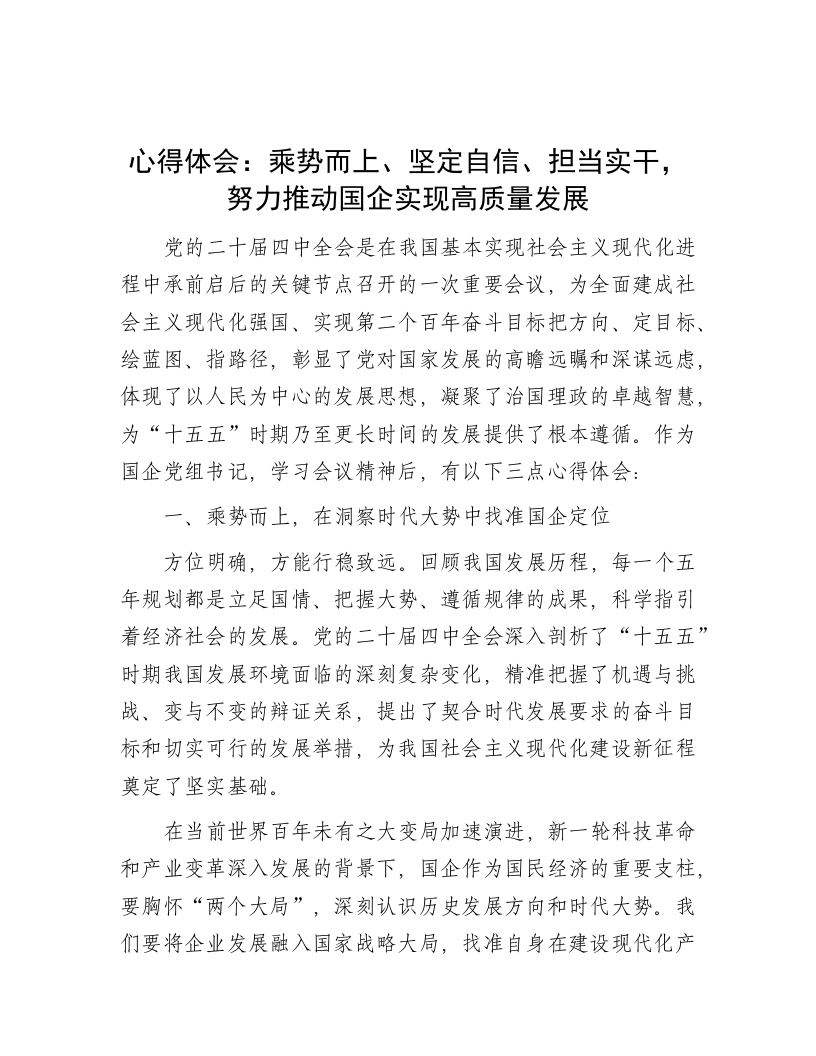 心得体会:乘势而上、坚定自信、担当实干,努力推动国企实现高质量发展