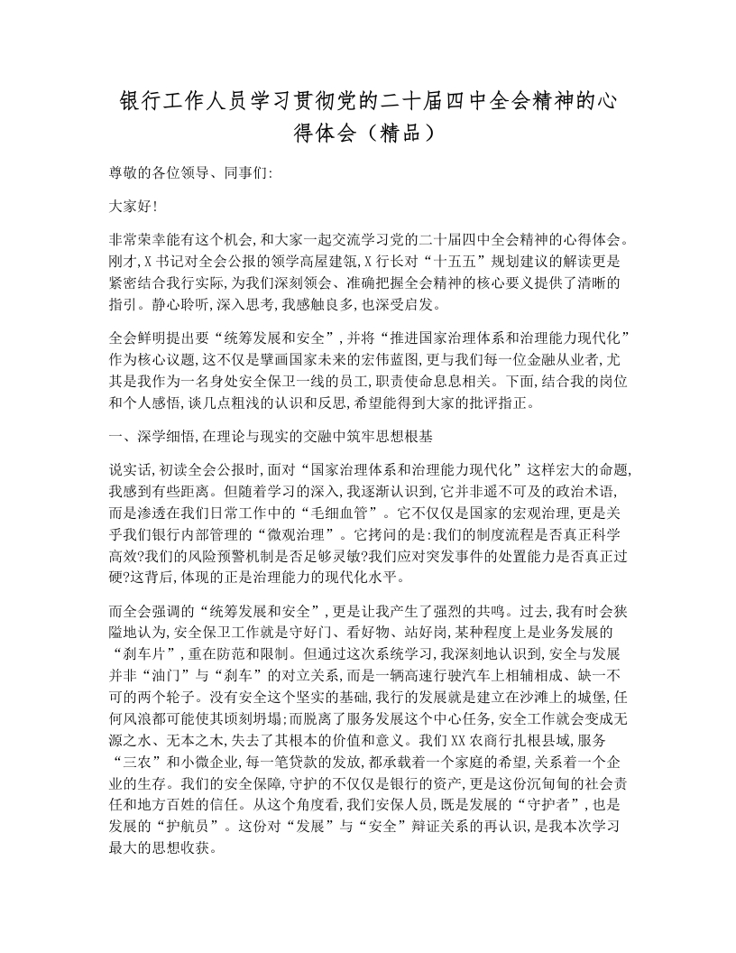 银行工作人员学习贯彻党的二十届四中全会精神的心得体会(精品)