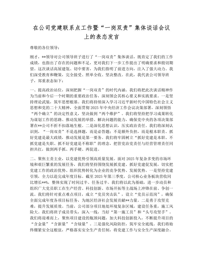 在公司党建联系点工作暨“一岗双责”集体谈话会议上的表态发言