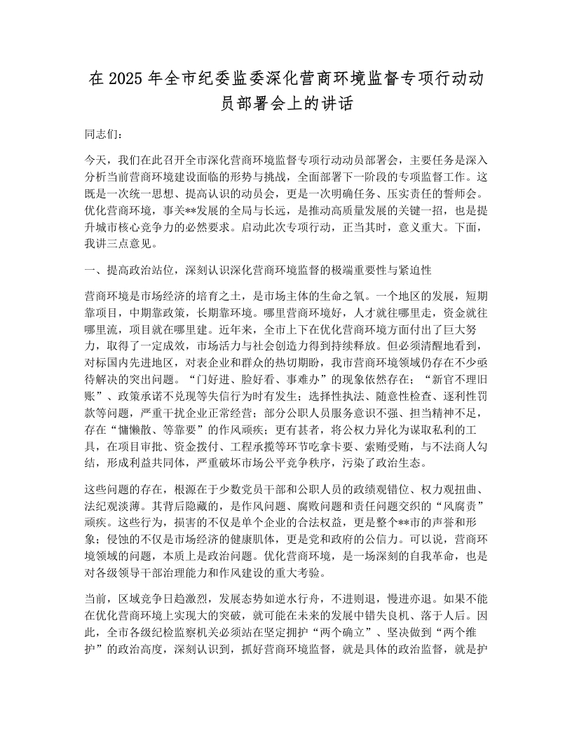 在2025年全市纪委监委深化营商环境监督专项行动动员部署会上的讲话