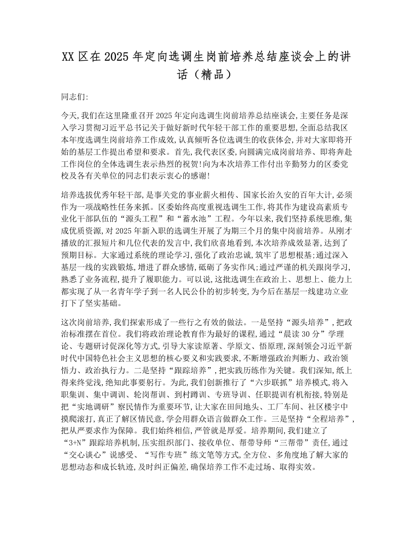 XX区在2025年定向选调生岗前培养总结座谈会上的讲话(精品)