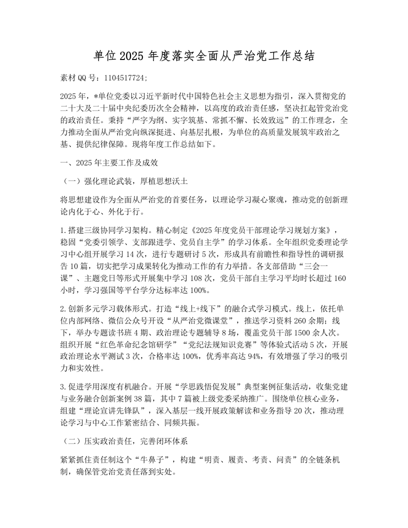 单位2025年度落实全面从严治党工作总结