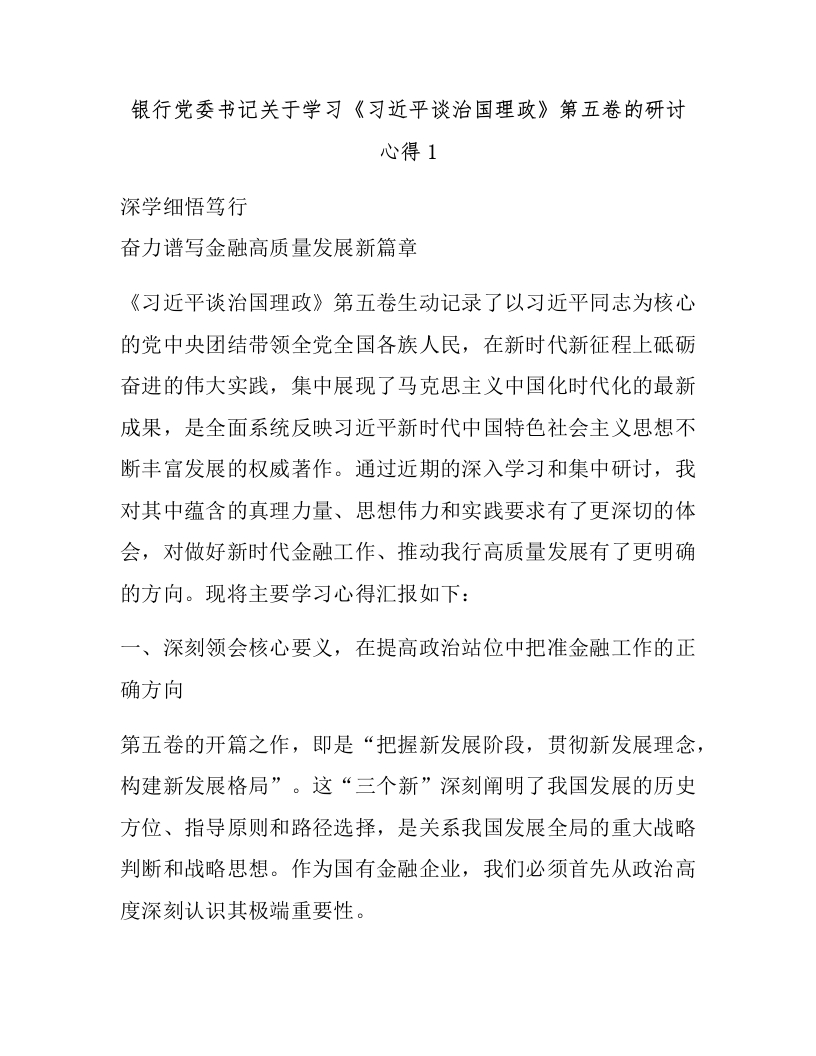 银行党委书记关于学习《习近平谈治国理政》第五卷的研讨心得1
