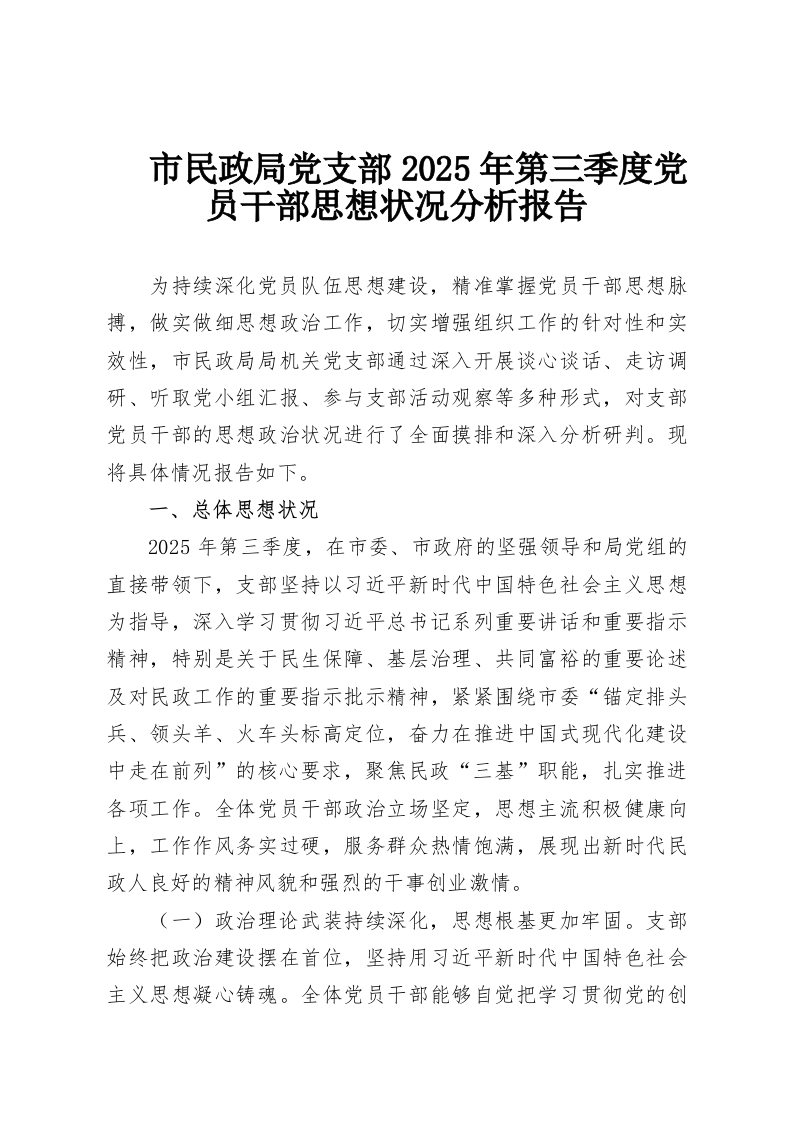 市民政局党支部2025年第三季度党员干部思想状况分析报告
