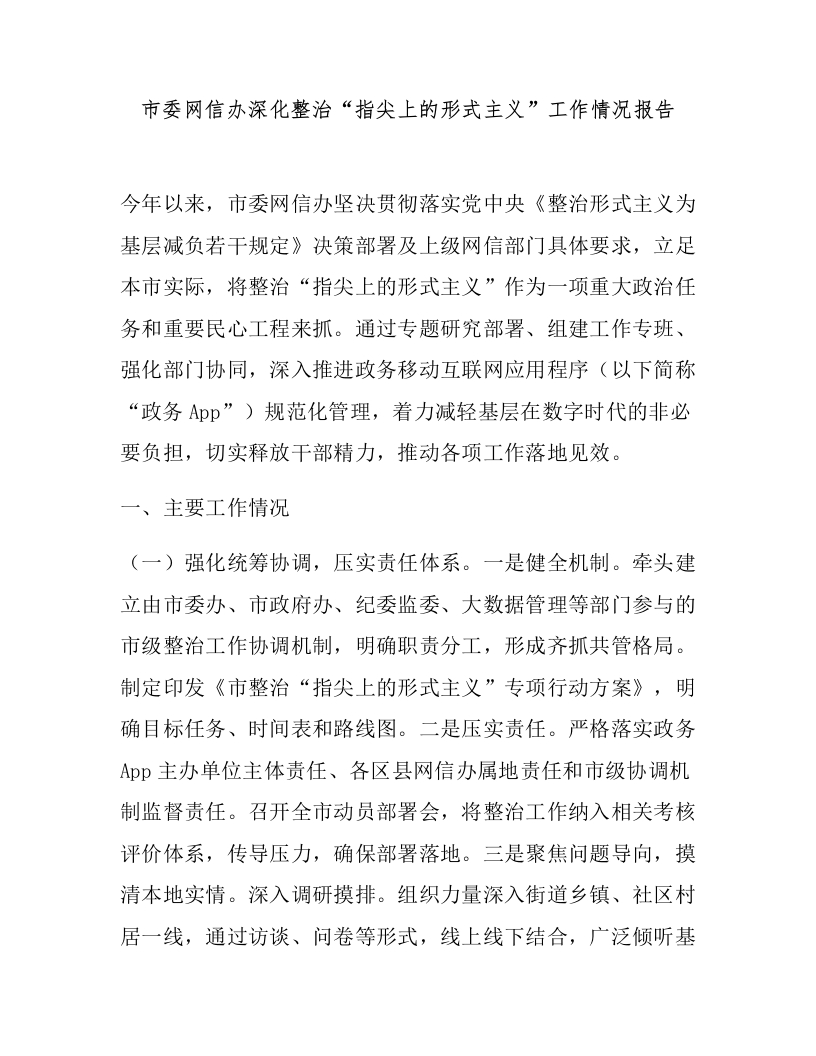 市委网信办深化整治“指尖上的形式主义”工作情况报告