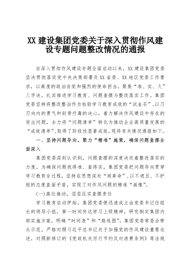 XX建设集团党委关于深入贯彻作风建设专题问题整改情况的通报
