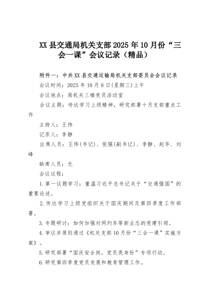 首页材料汇编综合材料XX县交通局机关支部2025年10月份“三会一课”会议记录(精品)