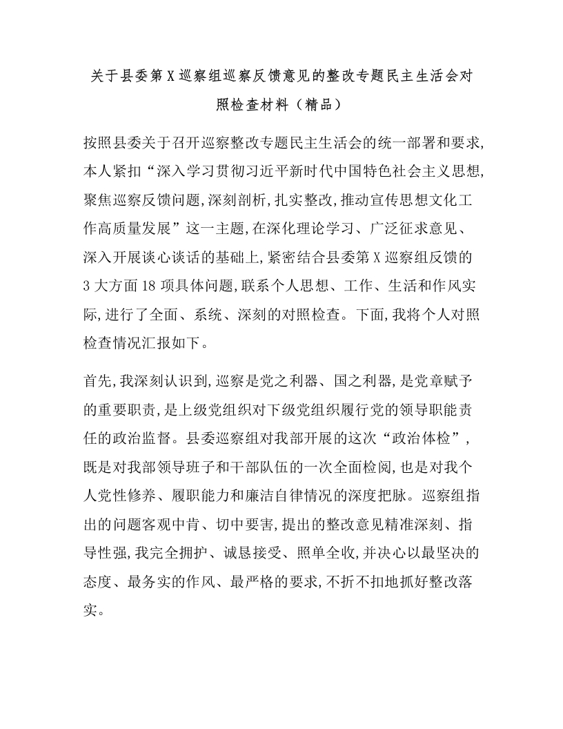关于县委第X巡察组巡察反馈意见的整改专题民主生活会对照检查材料(精品)