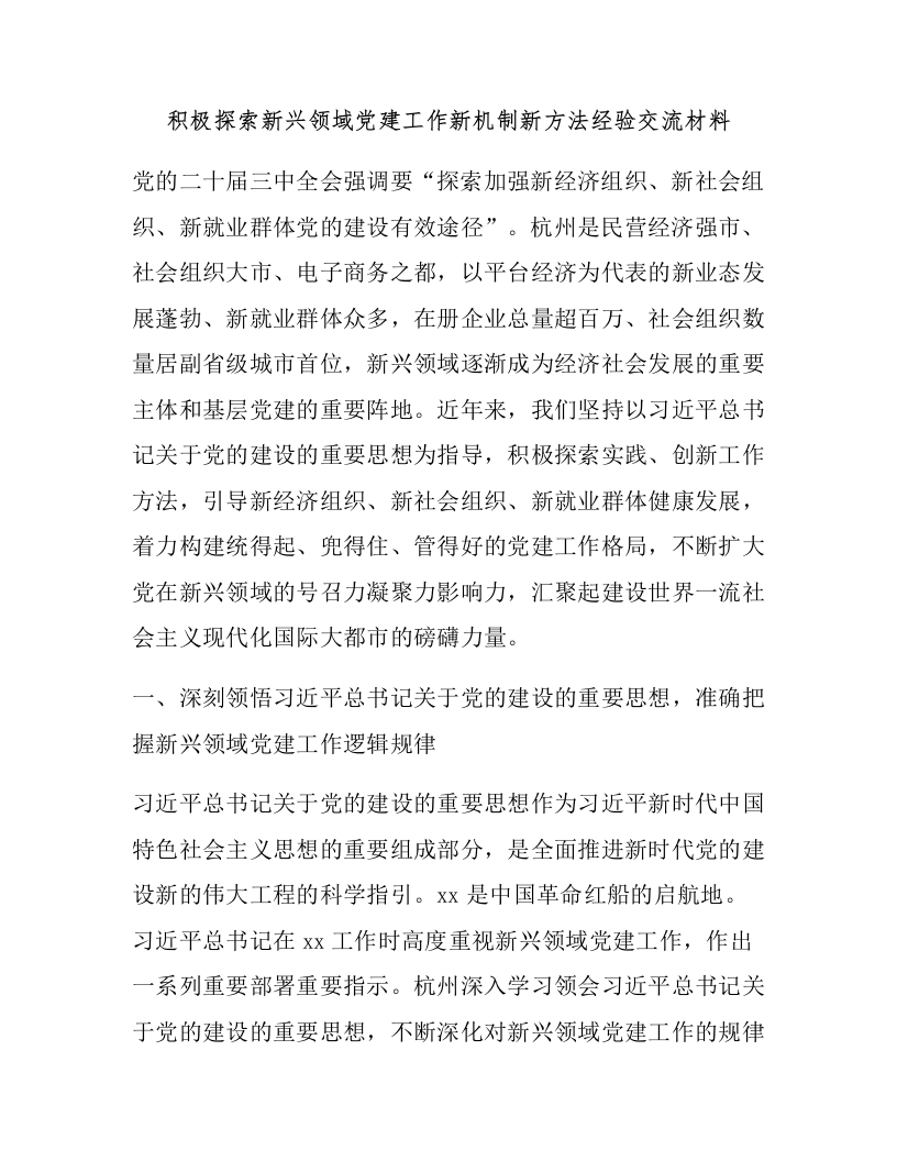 积极探索新兴领域党建工作新机制新方法经验交流材料