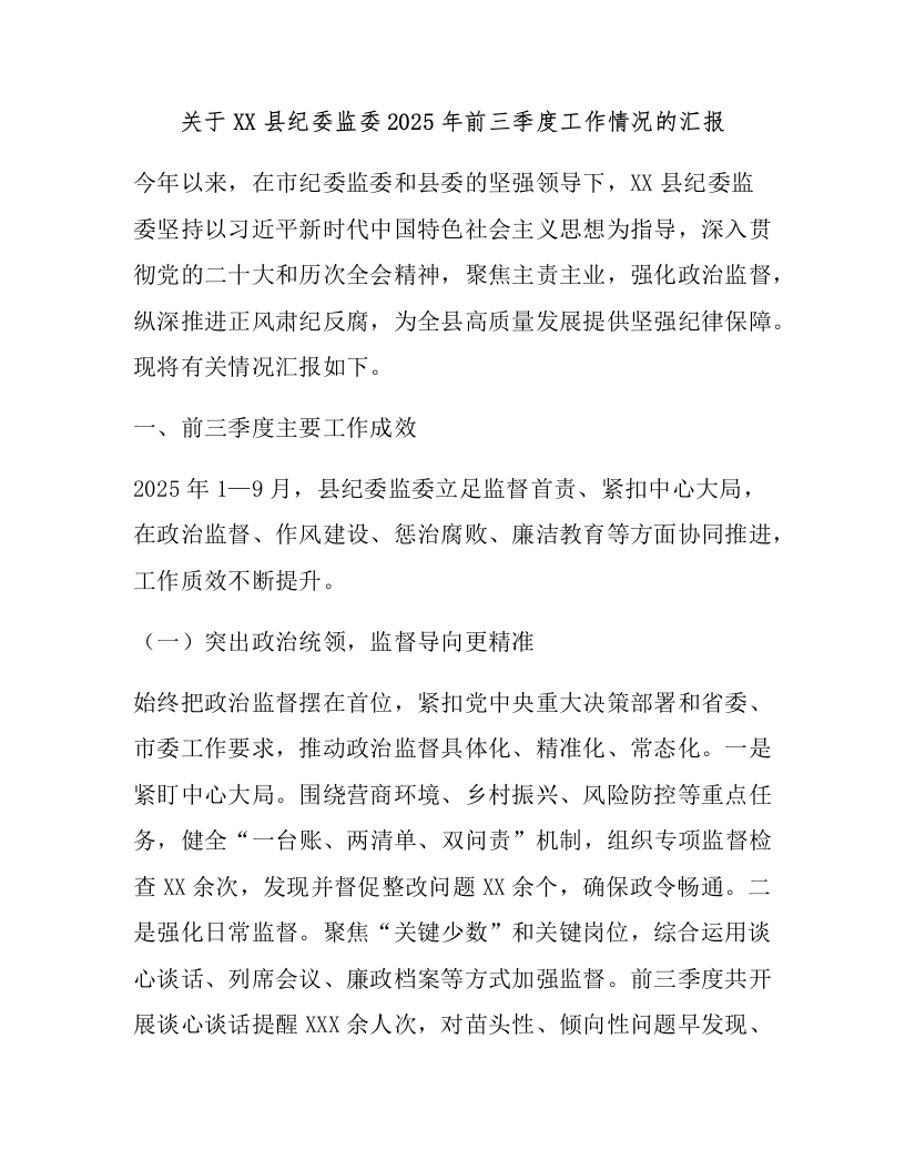 关于XX县纪委监委2025年前三季度工作情况的汇报