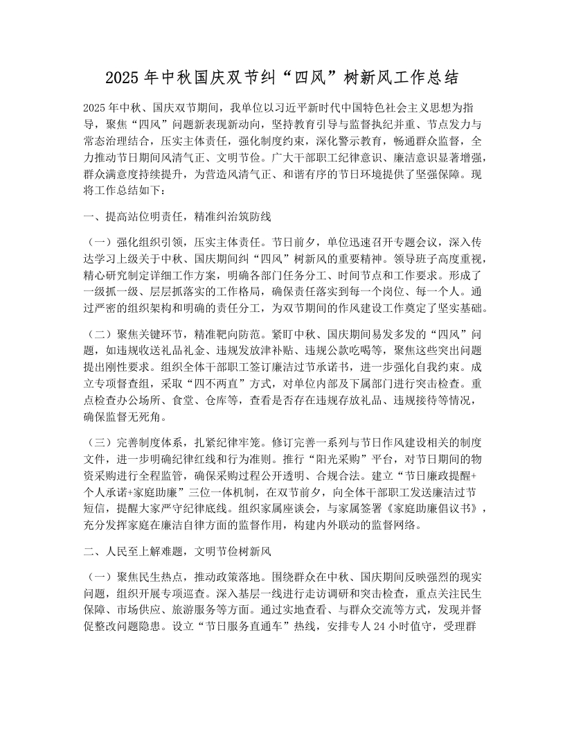 2025年中秋国庆双节纠“四风”树新风工作总结