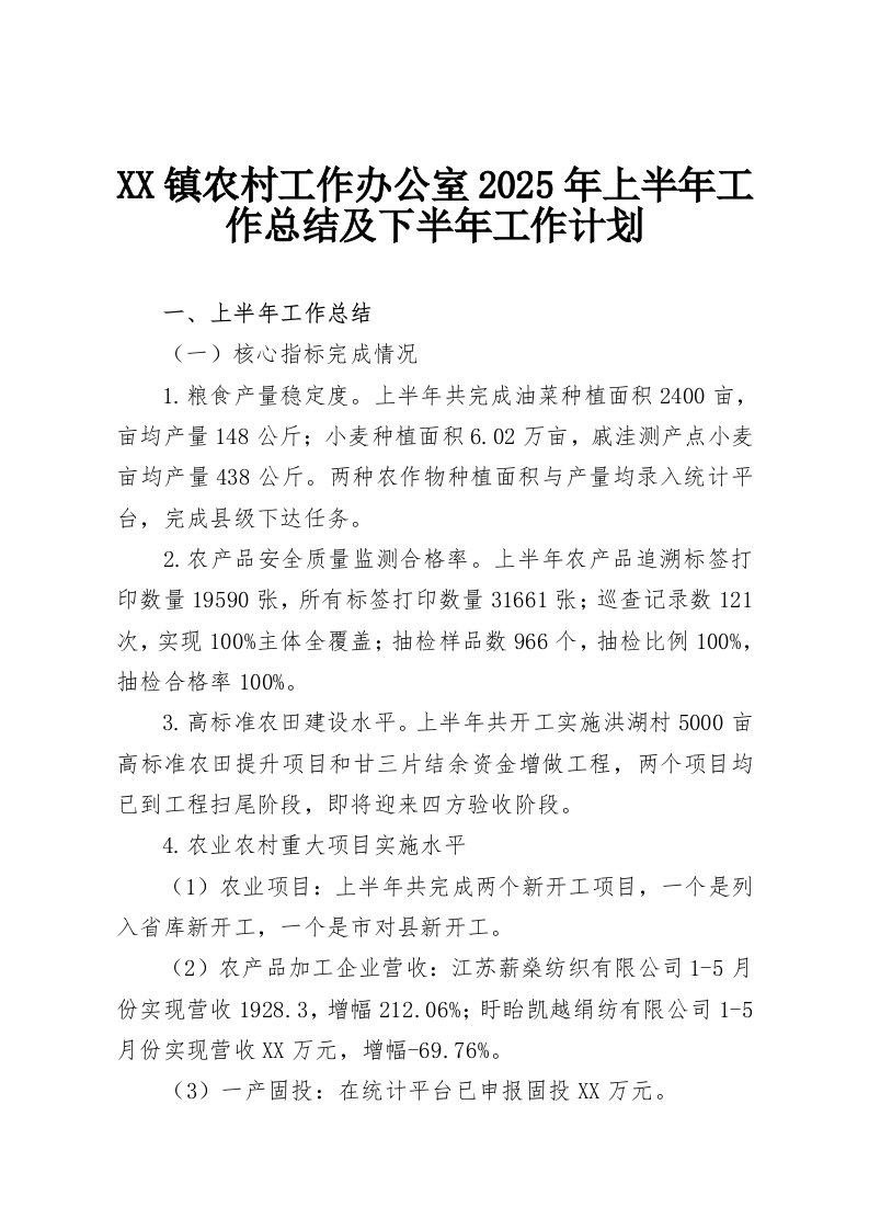 XX镇农村工作办公室2025年上半年工作总结及下半年工作计划