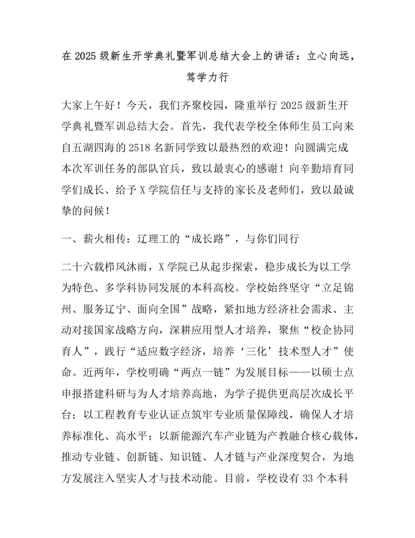 在2025级新生开学典礼暨军训总结大会上的讲话:立心向远,笃学力行