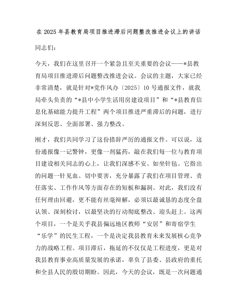 在2025年县教育局项目推进滞后问题整改推进会议上的讲话