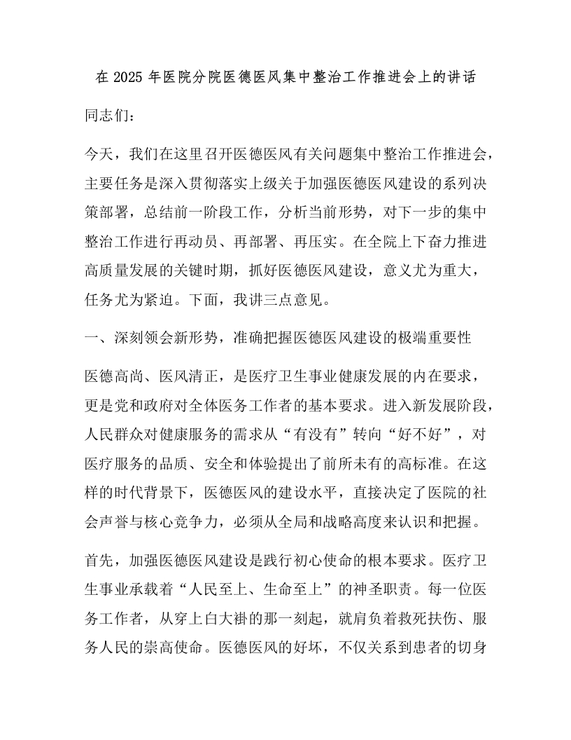 在2025年医院分院医德医风集中整治工作推进会上的讲话
