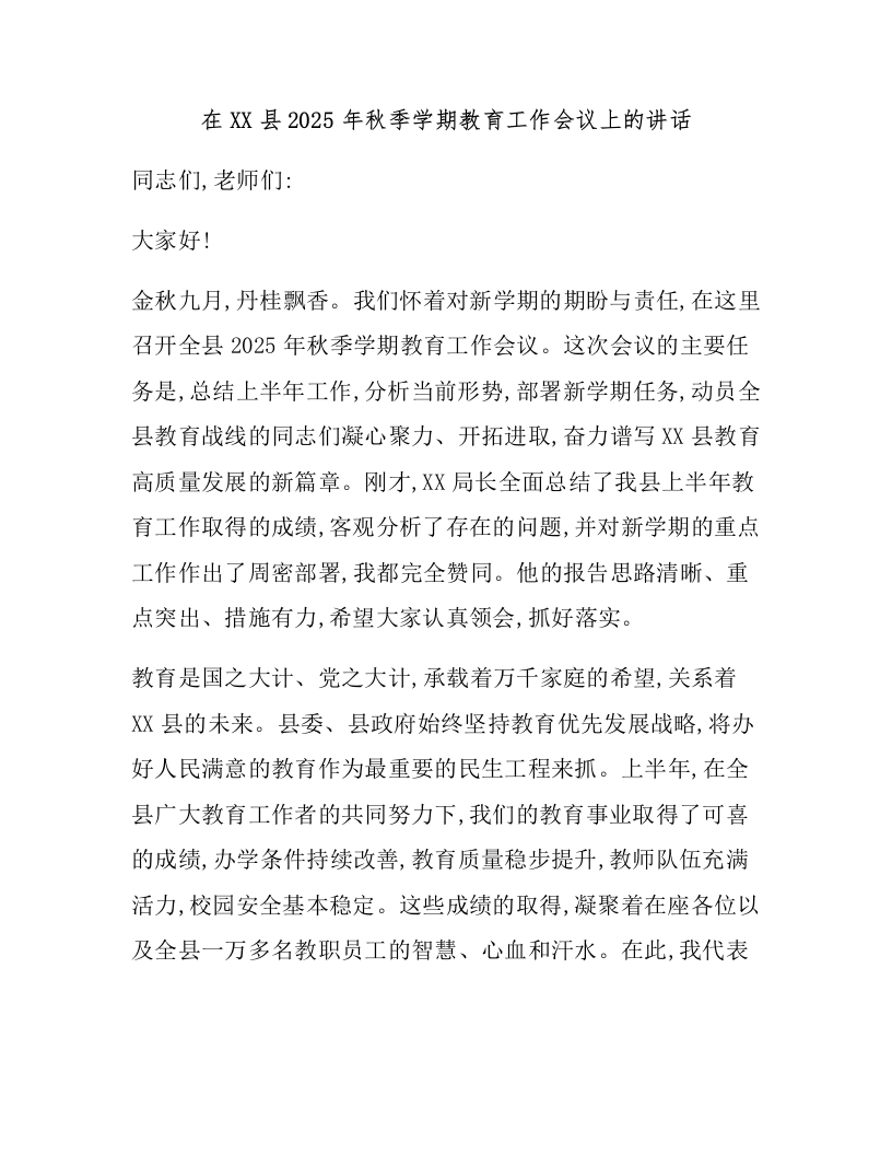 首页领导发言领导讲话在XX县2025年秋季学期教育工作会议上的讲话