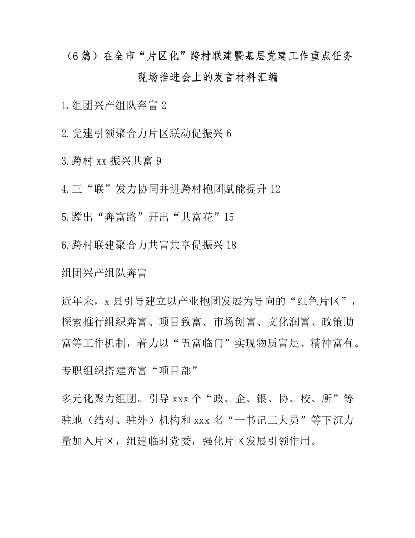 (6篇)在全市“片区化”跨村联建暨基层党建工作重点任务现场推进会上的发言材料汇编