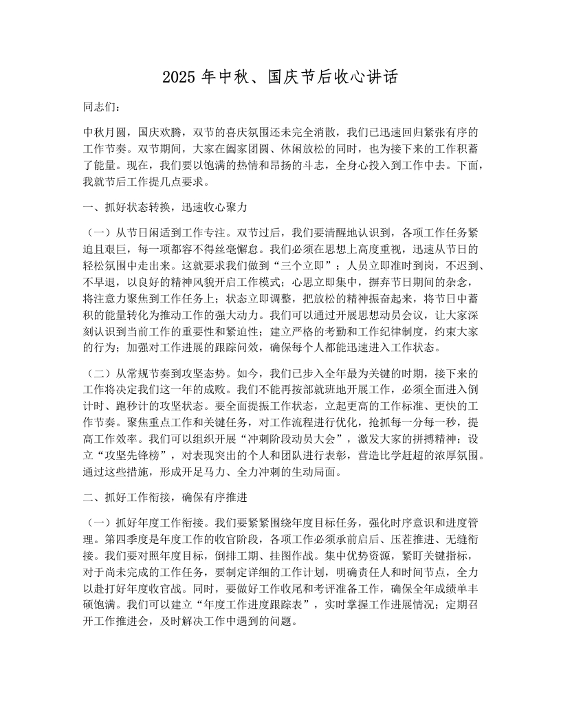 2025年中秋、国庆节后收心讲话