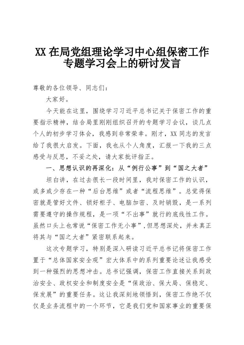 XX在局党组理论学习中心组保密工作专题学习会上的研讨发言