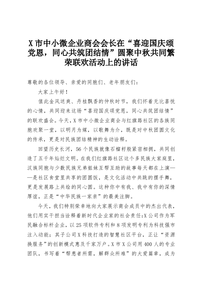 X市中小微企业商会会长在“喜迎国庆颂党恩,同心共筑团结情”圆聚中秋共同繁荣联欢活动上的讲话