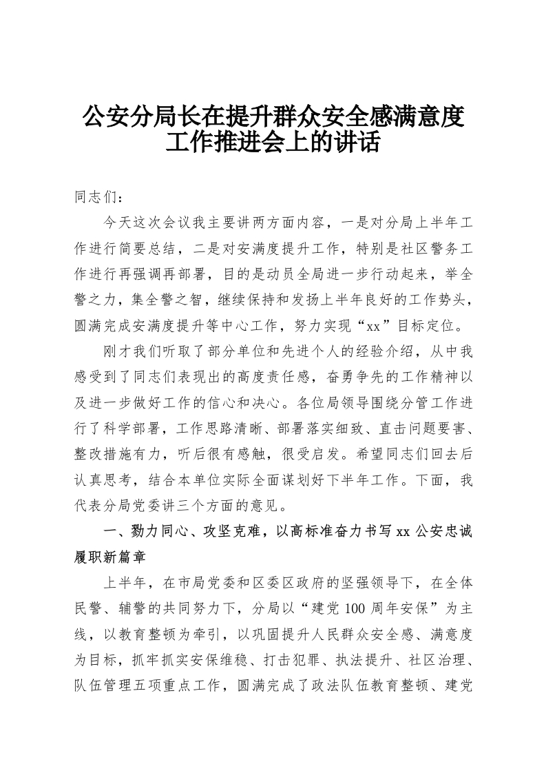 公安分局长在提升群众安全感满意度工作推进会上的讲话
