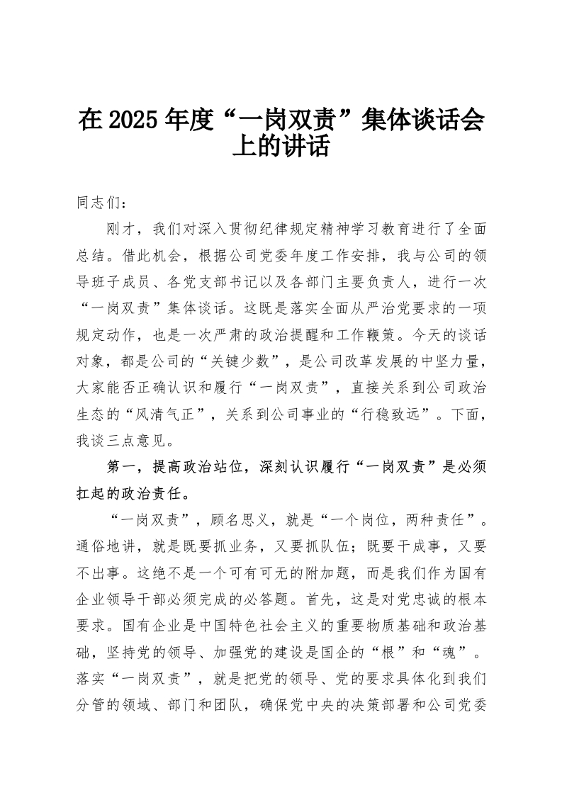 首页领导发言领导讲话在2025年度“一岗双责”集体谈话会上的讲话