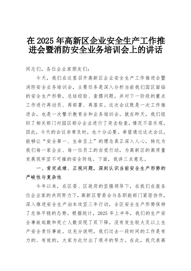 在2025年高新区企业安全生产工作推进会暨消防安全业务培训会上的讲话
