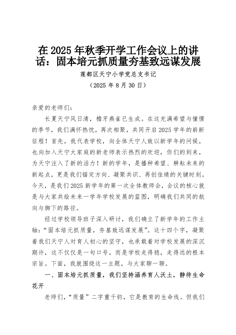 在2025年秋季开学工作会议上的讲话:固本培元抓质量夯基致远谋发展