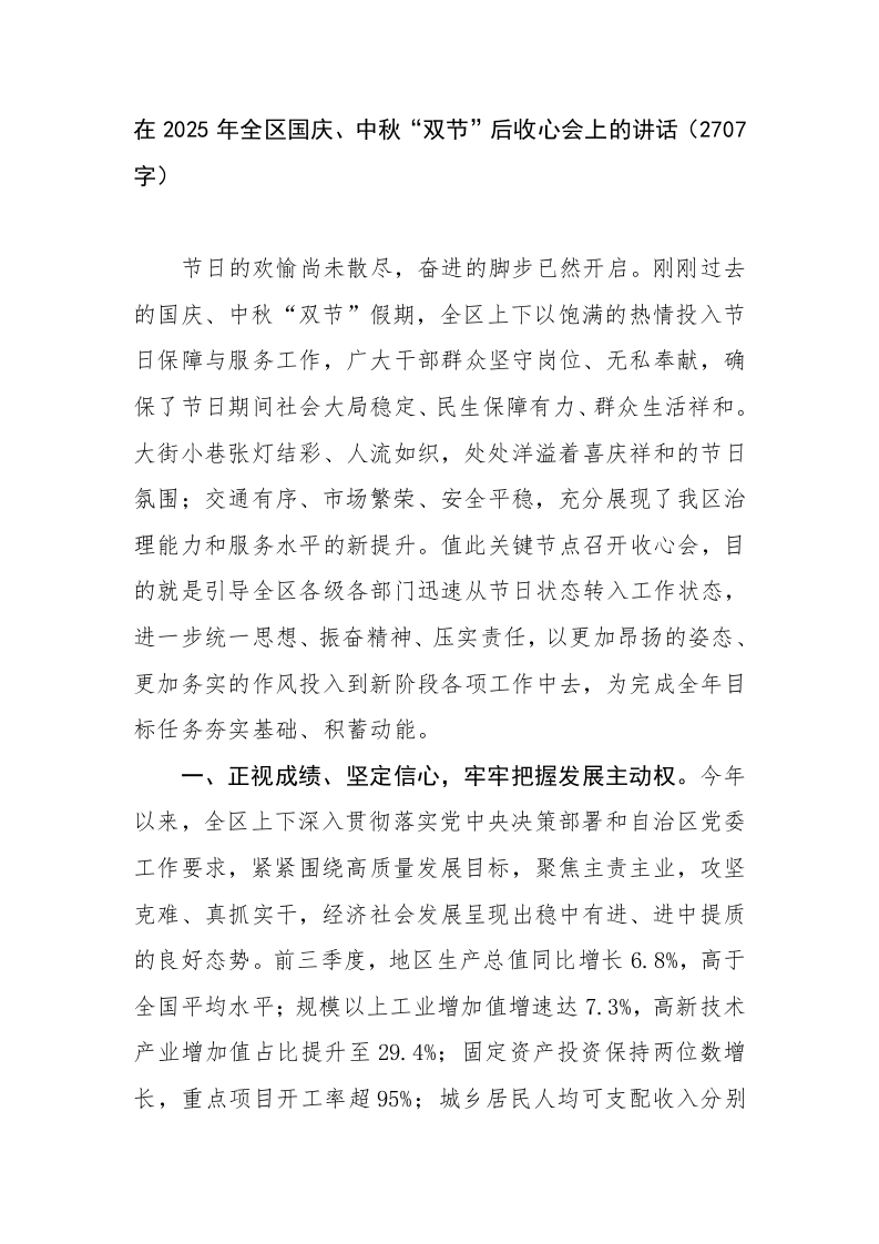 在2025年全区国庆、中秋“双节”后收心会上的讲话(2707字)