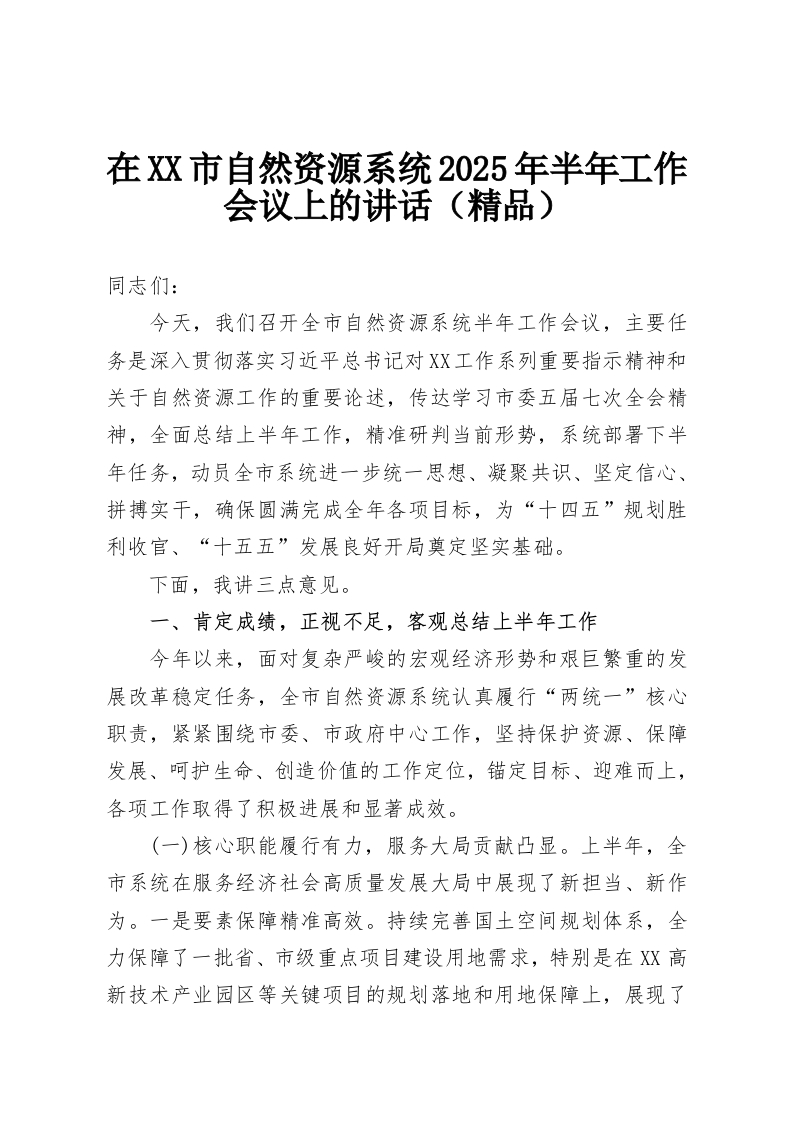 在XX市自然资源系统2025年半年工作会议上的讲话(精品)