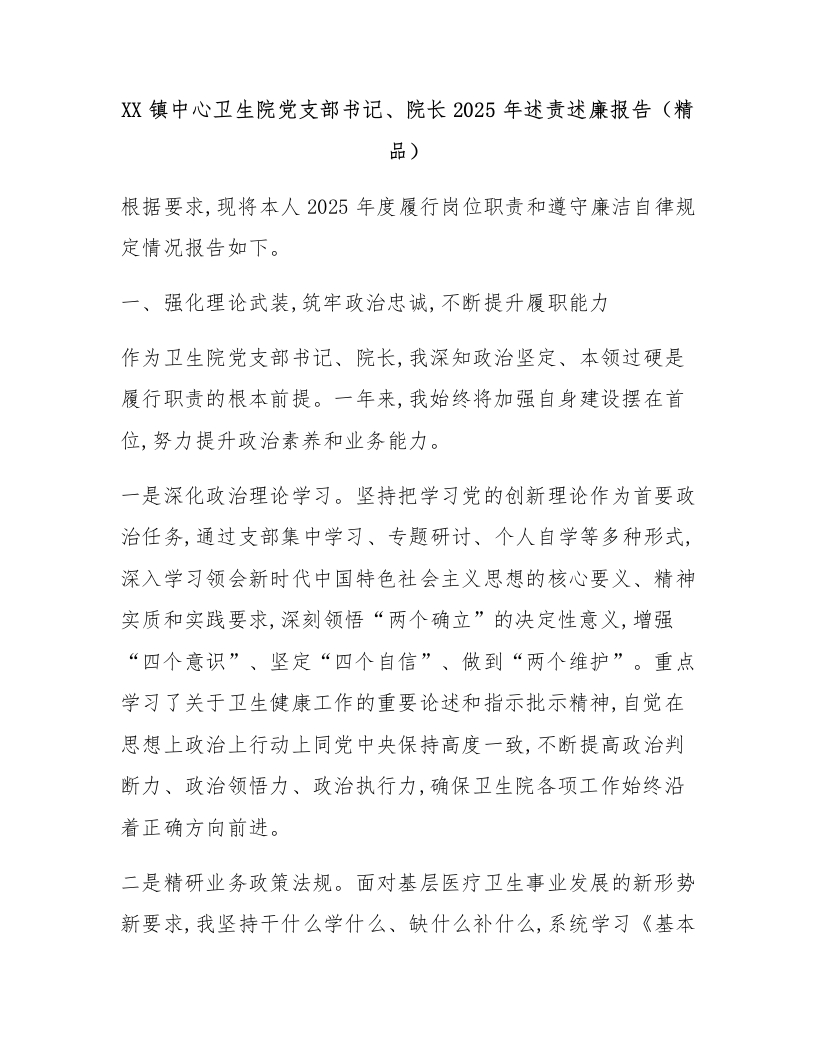 XX镇中心卫生院党支部书记、院长2025年述责述廉报告(精品)