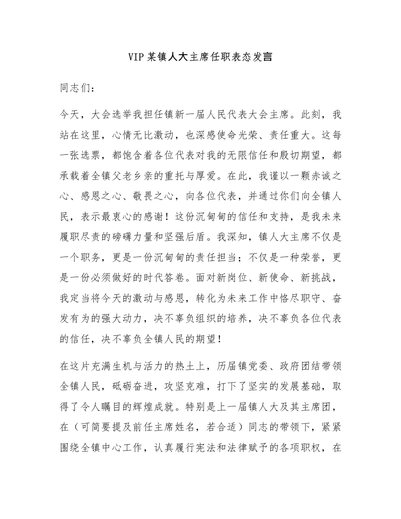 首页材料汇编综合材料某镇⼈⼤主席任职表态发⾔