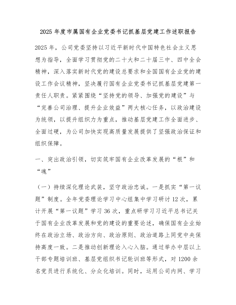 2025年度市属国有企业党委书记抓基层党建工作述职报告
