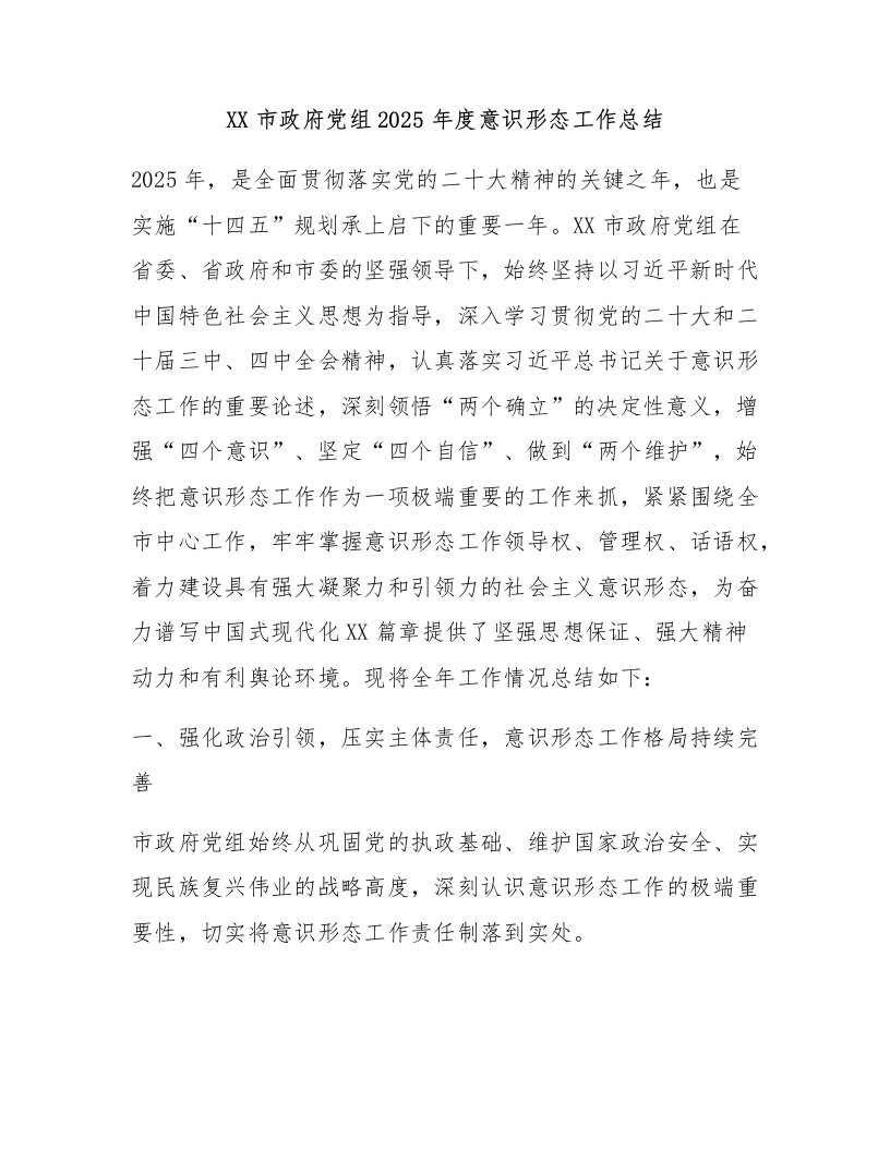 XX市政府党组2025年度意识形态工作总结