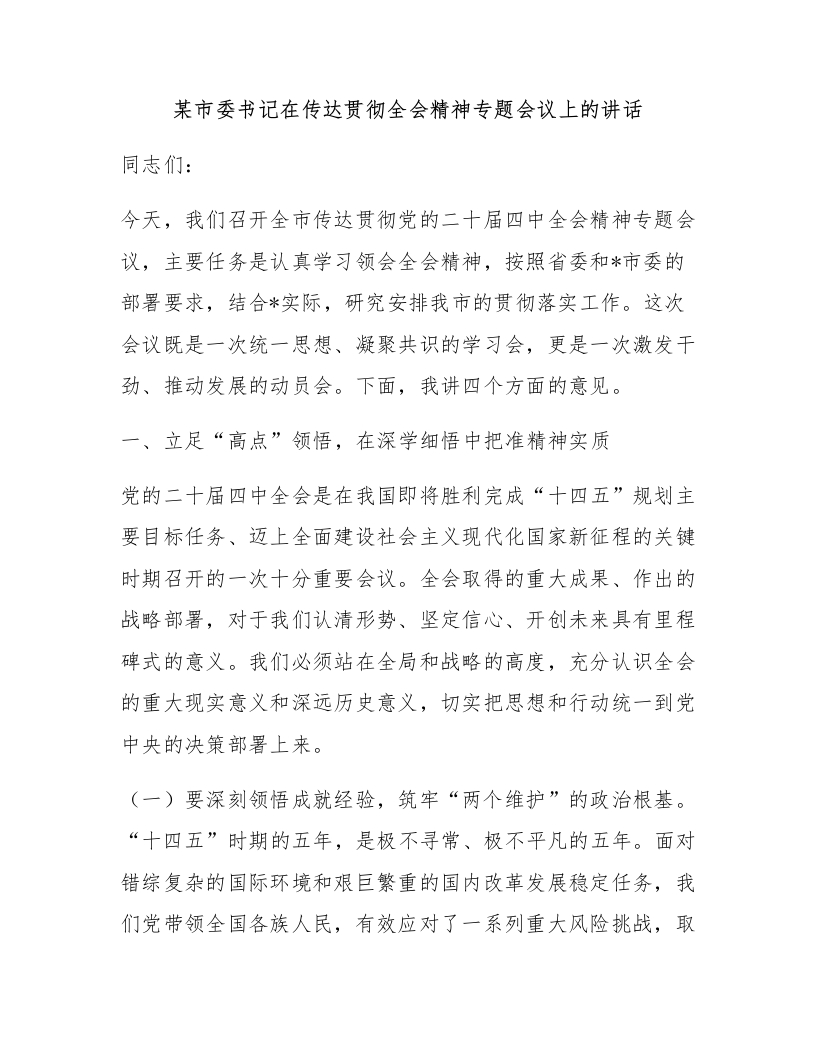 某市委书记在传达贯彻全会精神专题会议上的讲话
