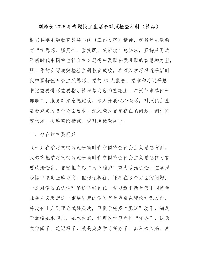 首页热门分类民主生活会副局长2025年专题民主生活会对照检查材料(精品)