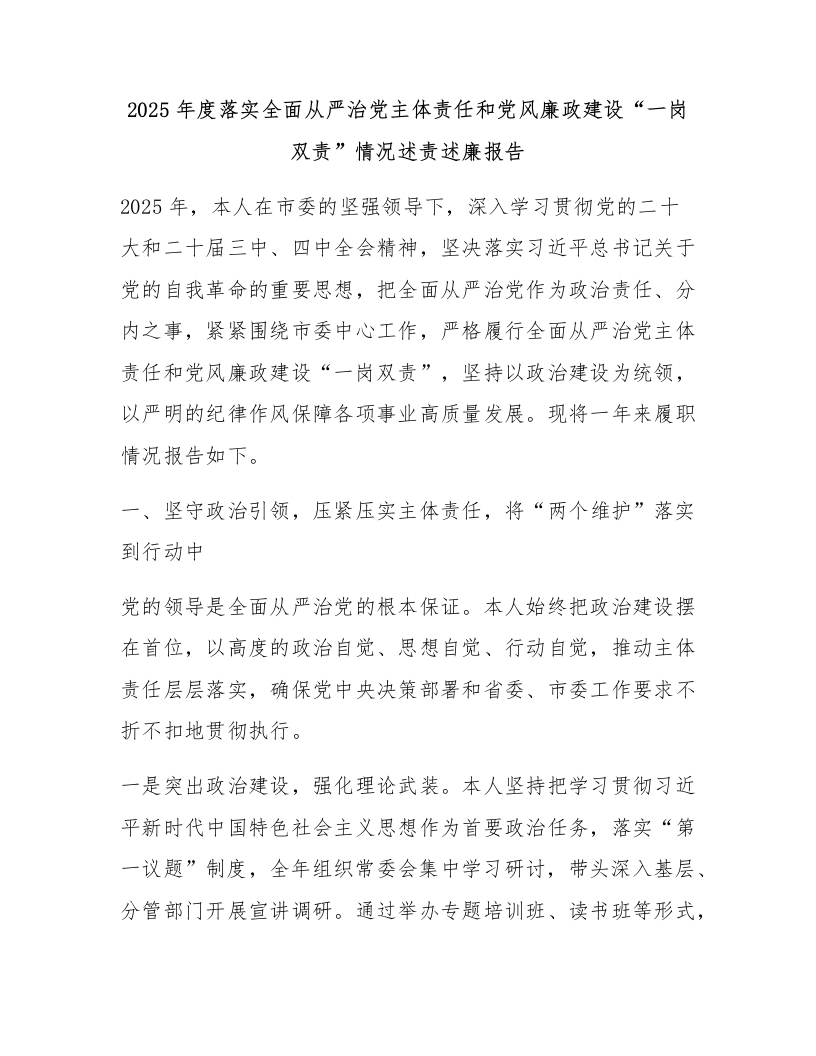 2025年度落实全面从严治党主体责任和党风廉政建设“一岗双责”情况述责述廉报告