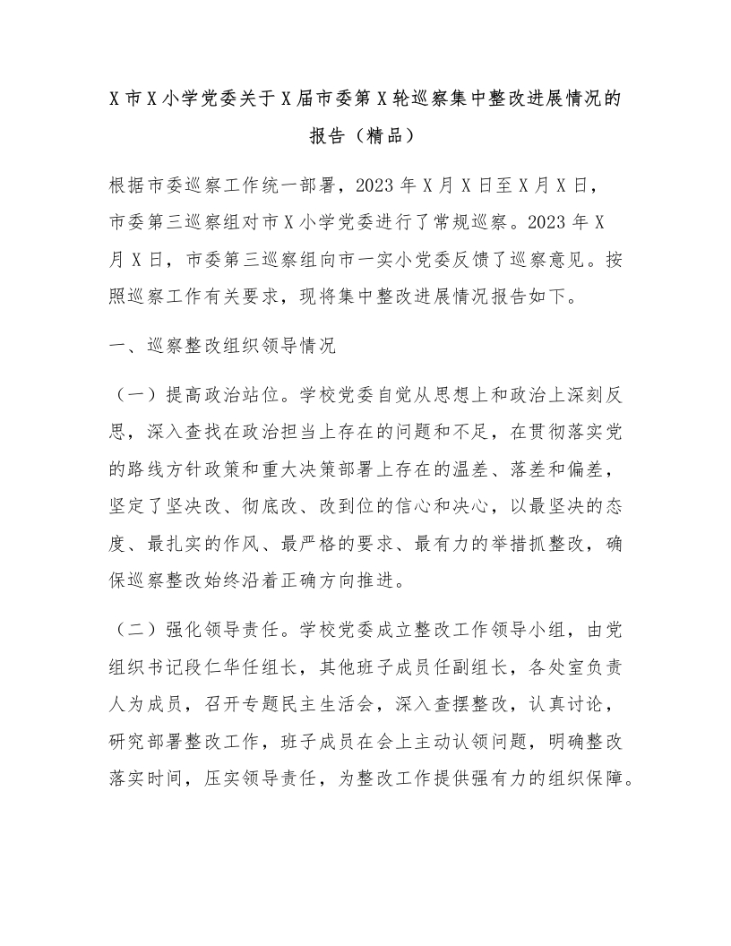 X市X小学党委关于X届市委第X轮巡察集中整改进展情况的报告(精品)