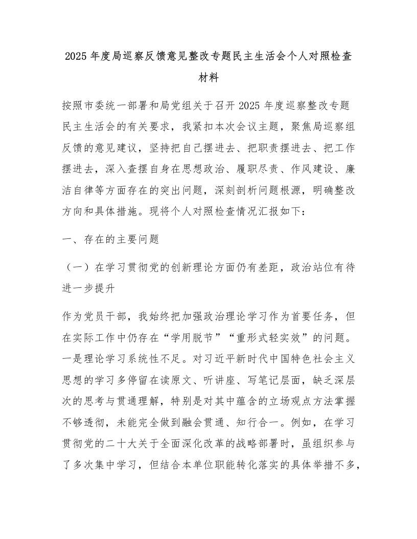 首页材料汇编综合材料2025年度局巡察反馈意见整改专题民主生活会个人对照检查材料