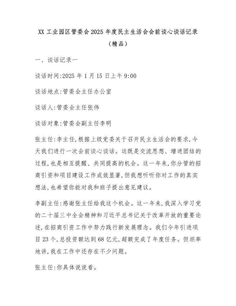 XX工业园区管委会2025年度民主生活会会前谈心谈话记录(精品)