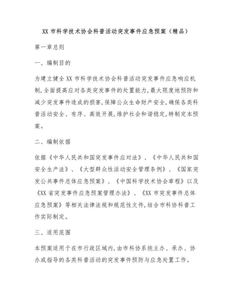 XX市科学技术协会科普活动突发事件应急预案(精品)
