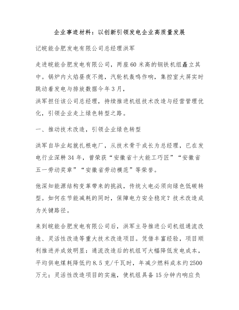首页材料汇编综合材料企业事迹材料:以创新引领发电企业高质量发展