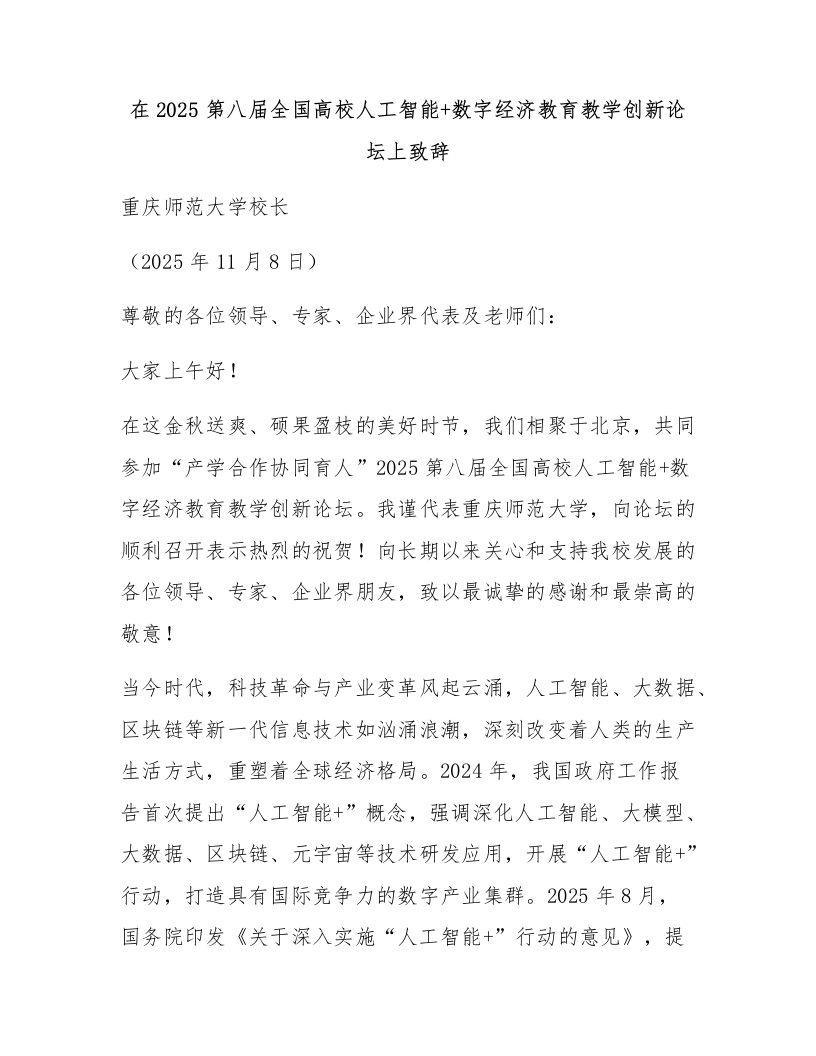 首页材料汇编综合材料在2025第八届全国高校人工智能+数字经济教育教学创新论坛上致辞